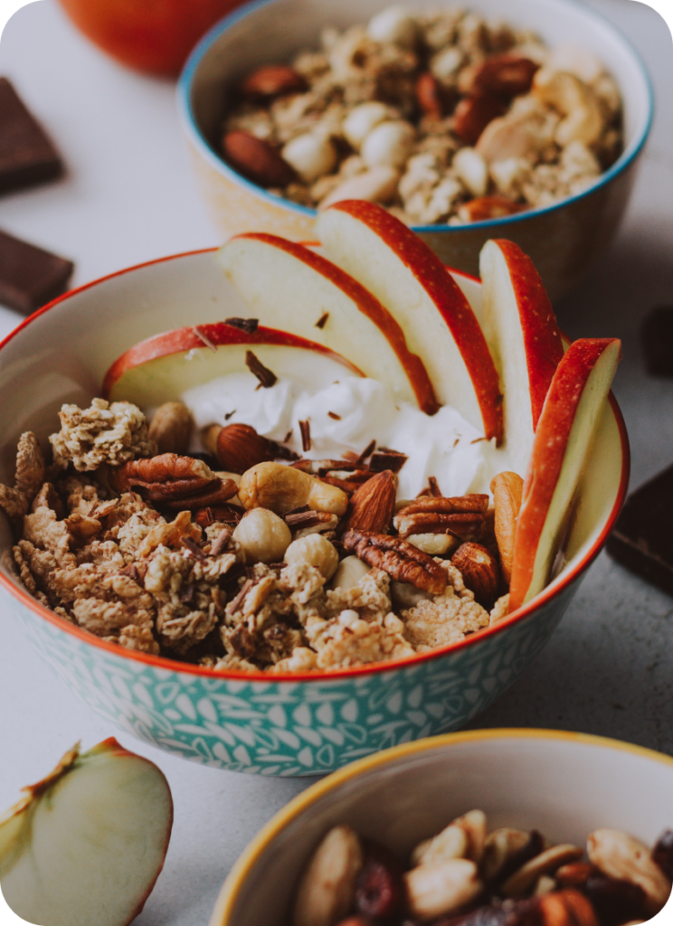 Lave y desinfecte el banano y la manzana. Pique  la manzana y el banano en trozos pequeños. Finalmente, en un recipiente incorpore el yogurt, la granola, el maní y la fruta picada.